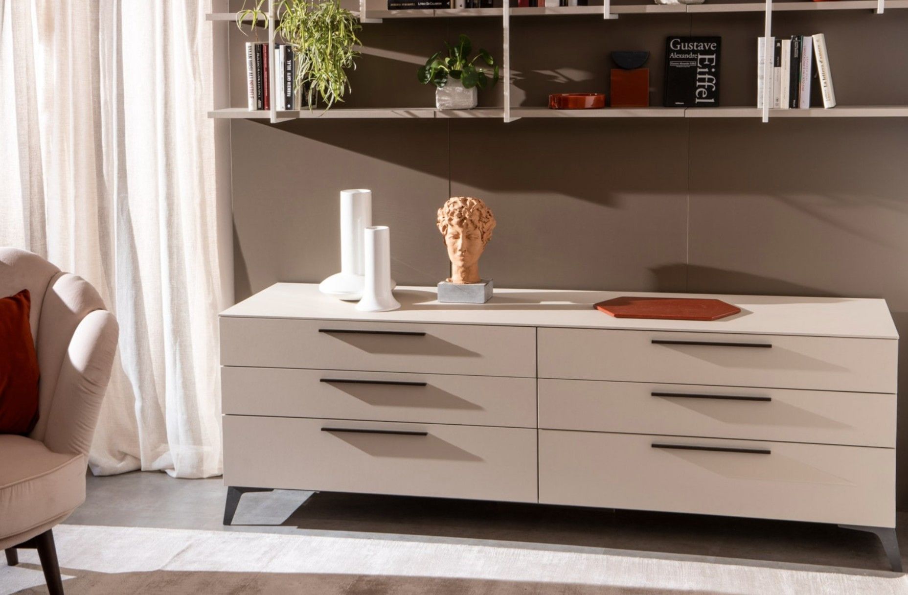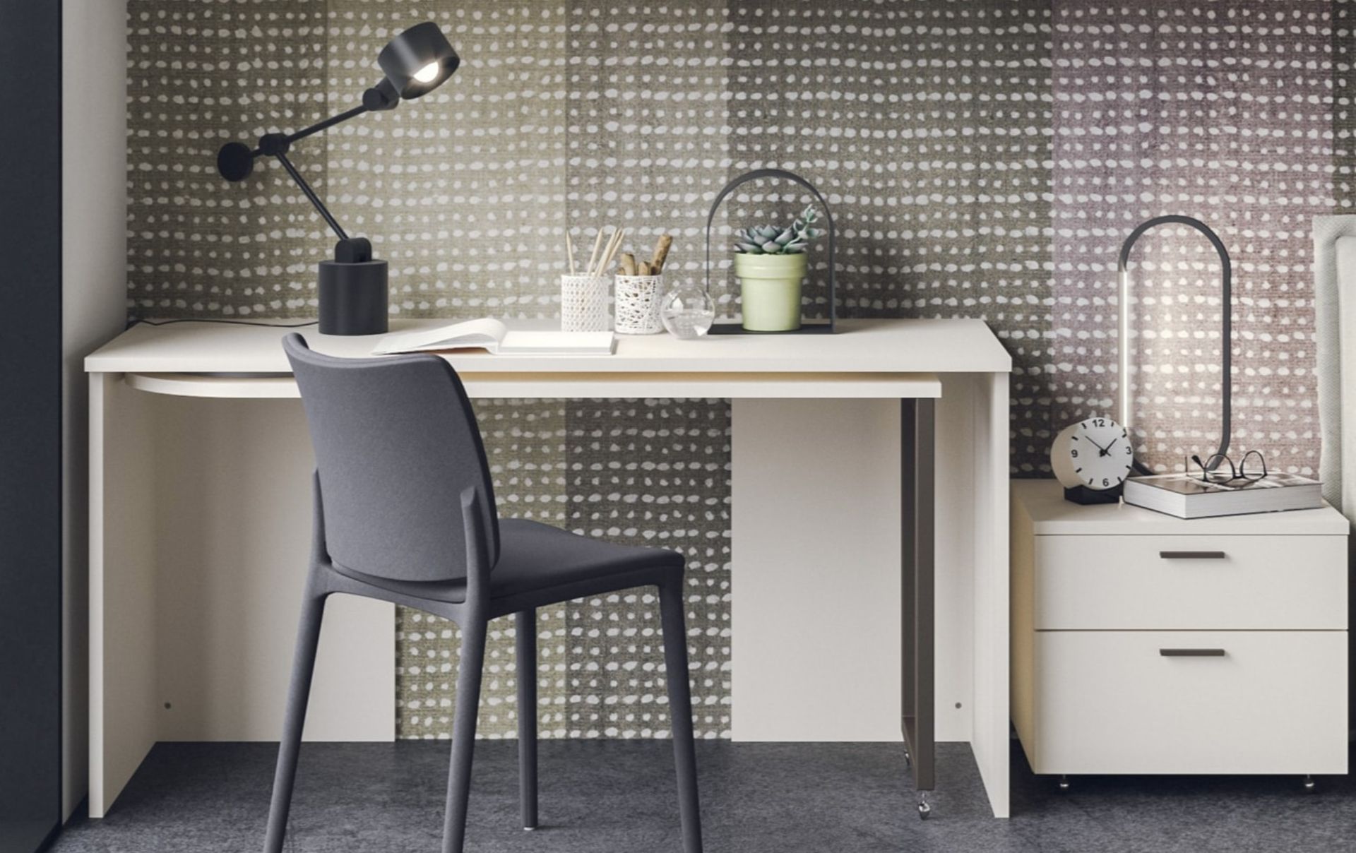 Il nostro sistema di complementi a un programma multifunzionale che abbiamo realizzato per soddisfare le esigenze del quotidiano, spaziando dalle diverse tipologie di scrivanie e librerie, fino ai complementi e accessori, per vivere la notte e il giorno unendo l'eleganza del design e l'elasticità nelle soluzioni d'arredo con linee essenziali di tendenza e di elevata ricerca estetica.